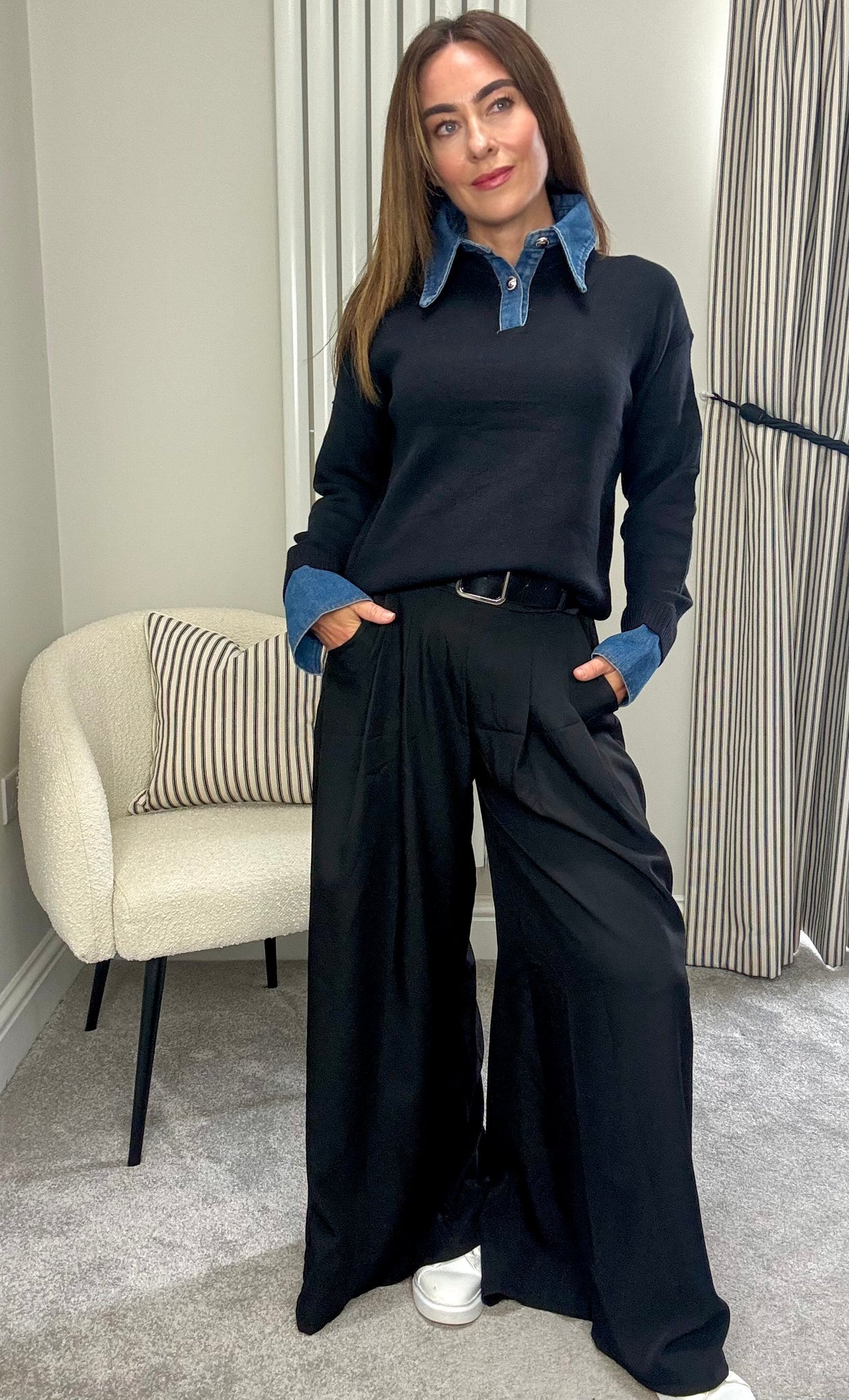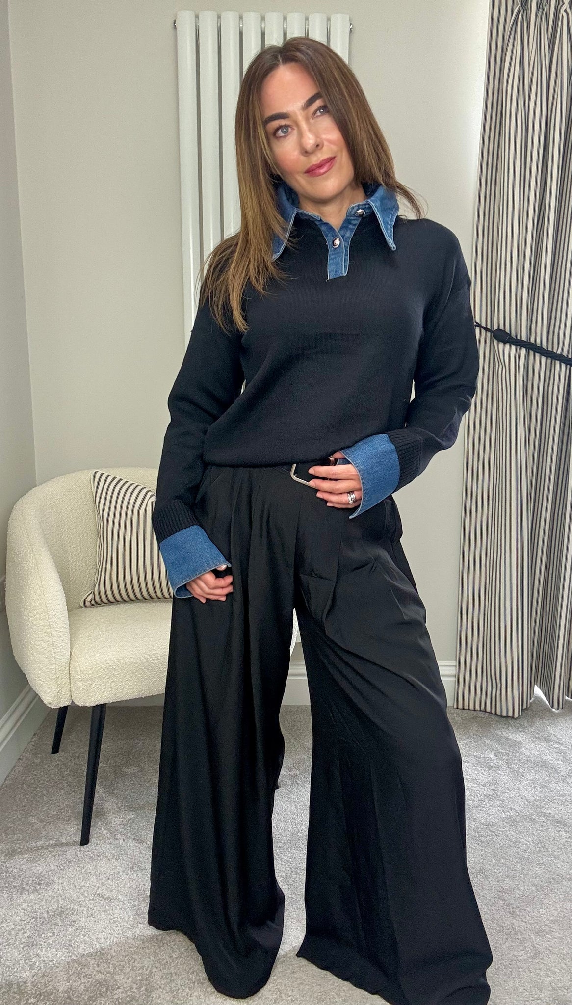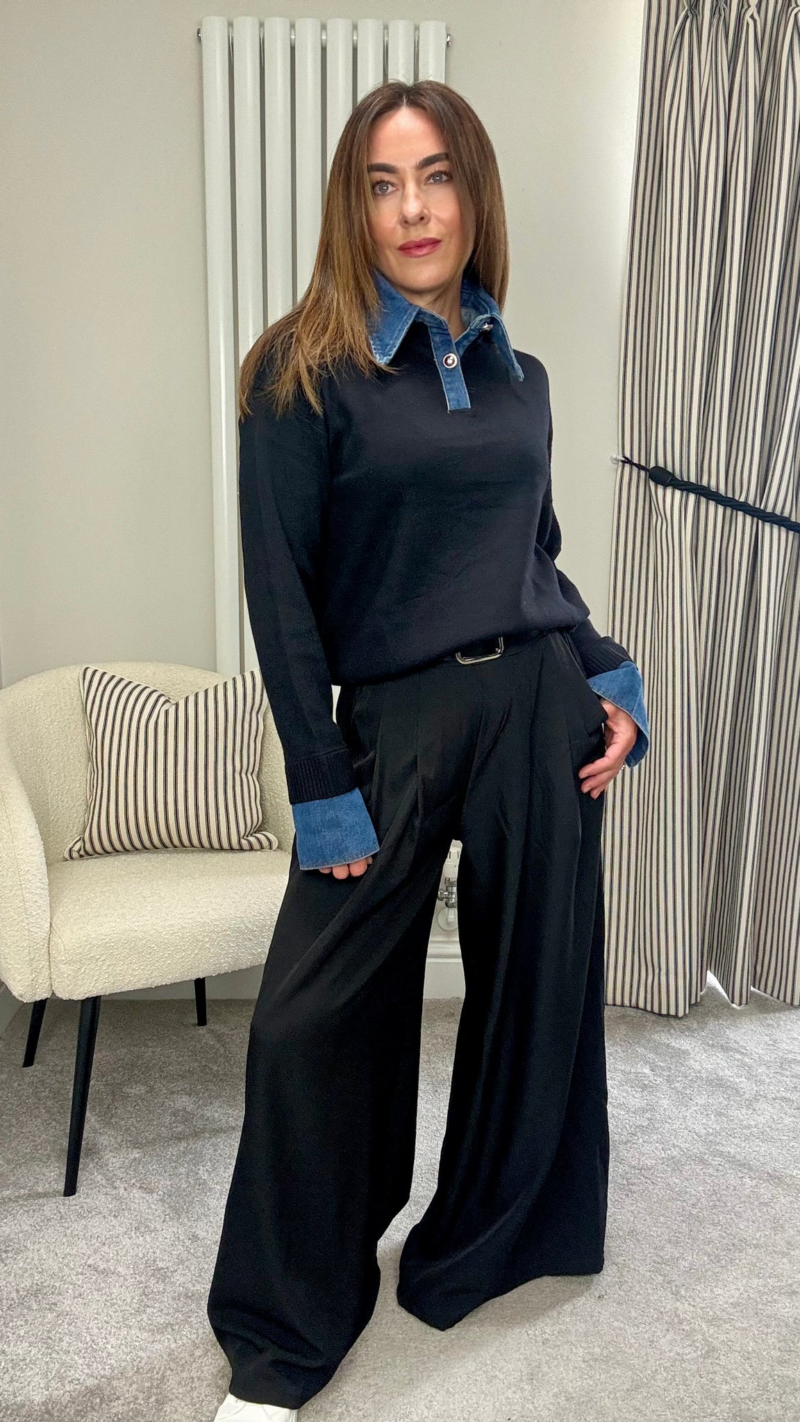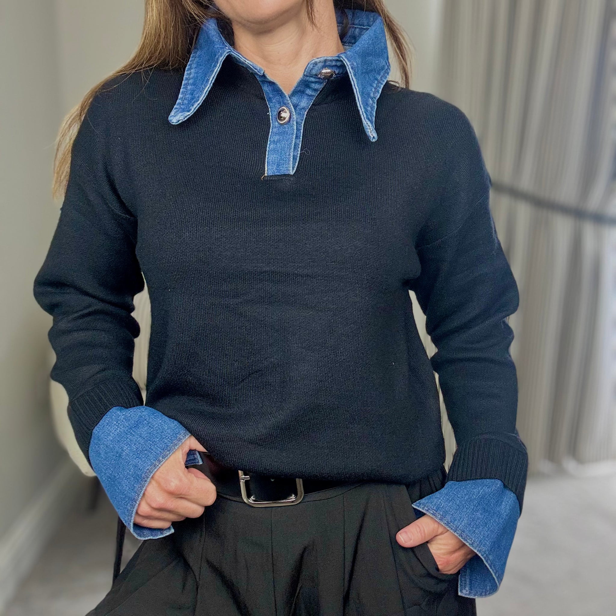 Classic knitwear, but with a denim edge. This black sweater is finished with a bold contrast denim collar, placket and cuffs — the layered look without the effort. Smart enough for work, cool enough for weekends, and easy to style tucked into tailored trousers or laid-back denim.
