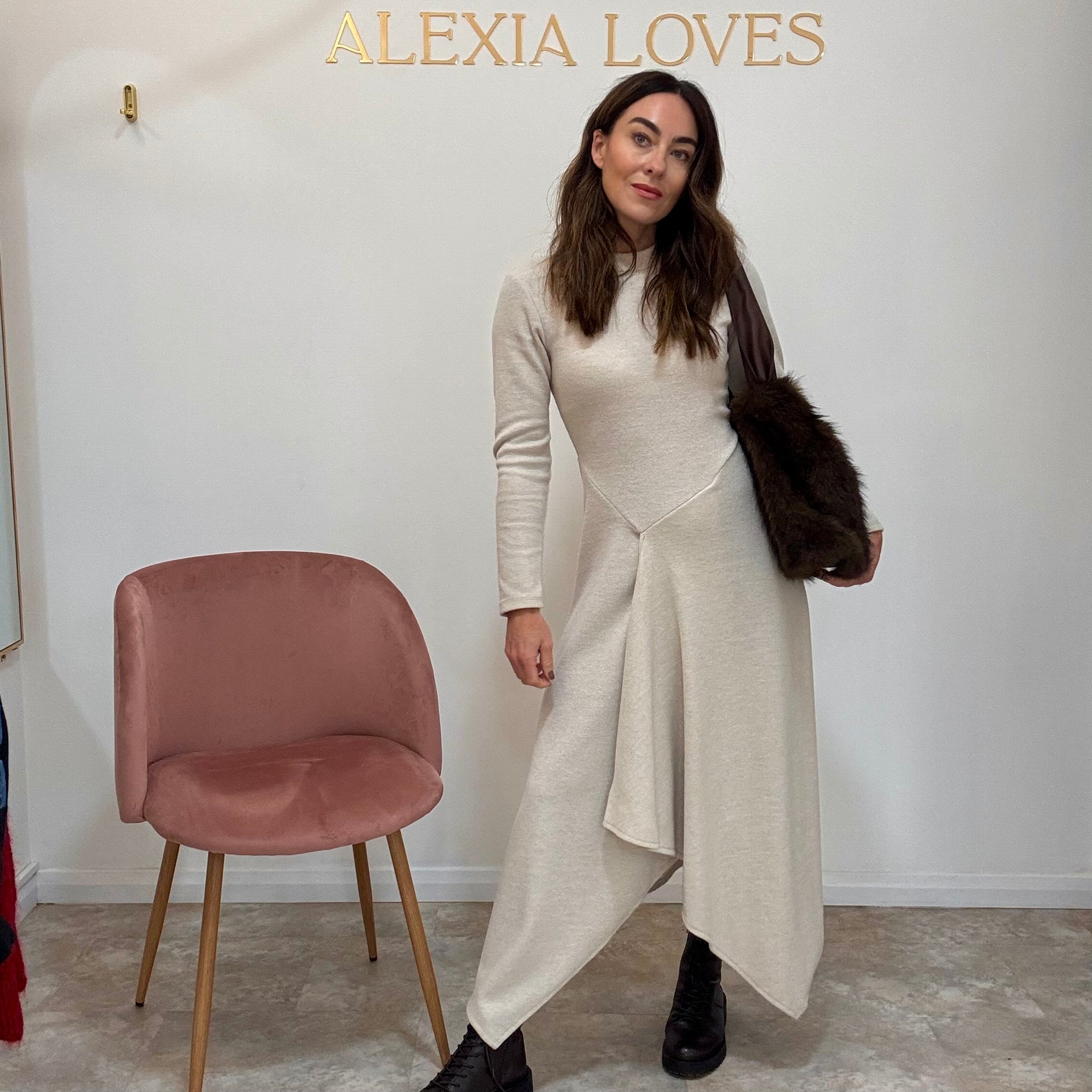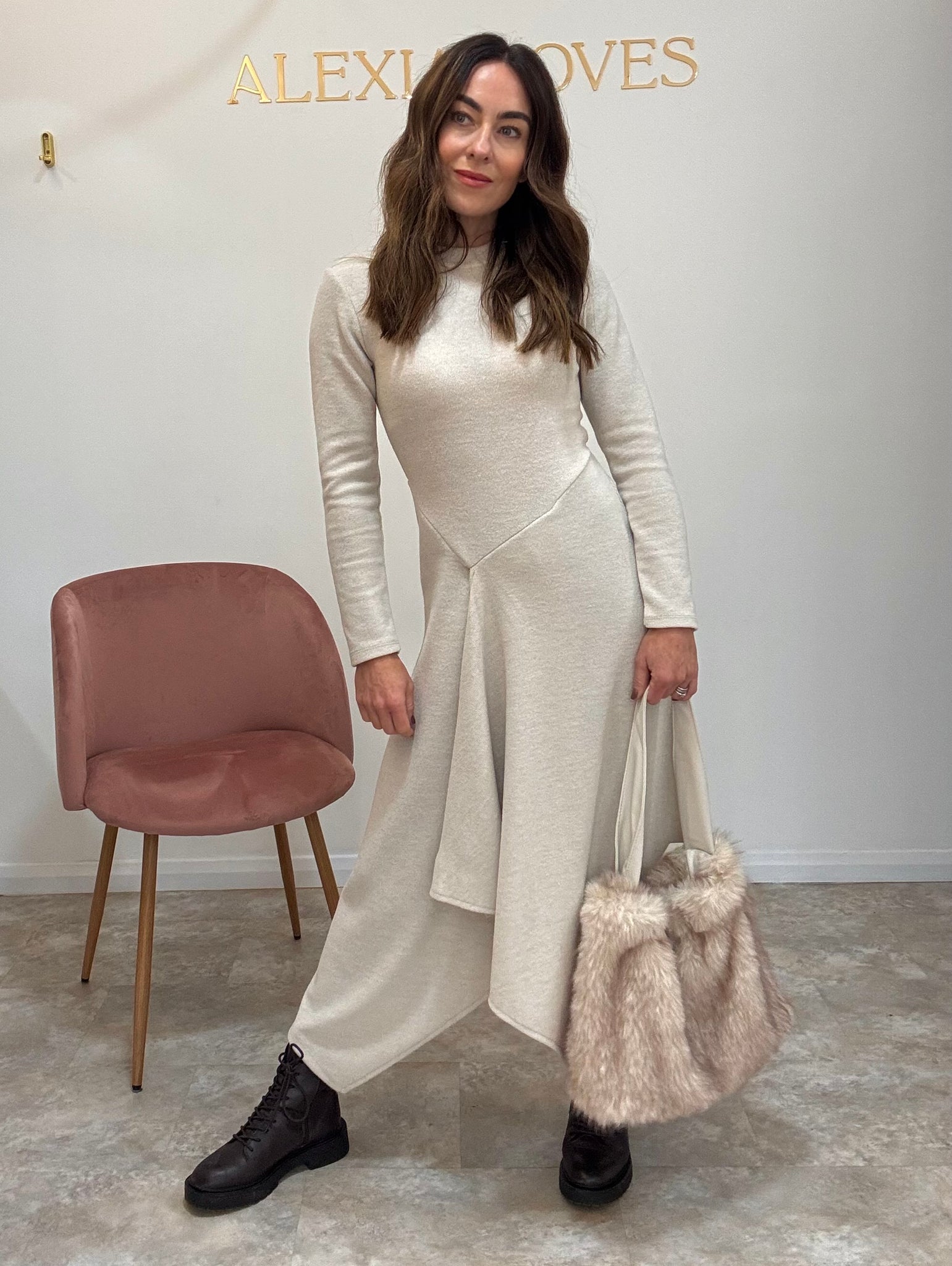 A soft knit dress that does comfort and shape in one. Designed with long sleeves, a flattering elasticated waist and a handkerchief-style hem that drapes beautifully as you move. Effortless, feminine and easy to dress up or down.