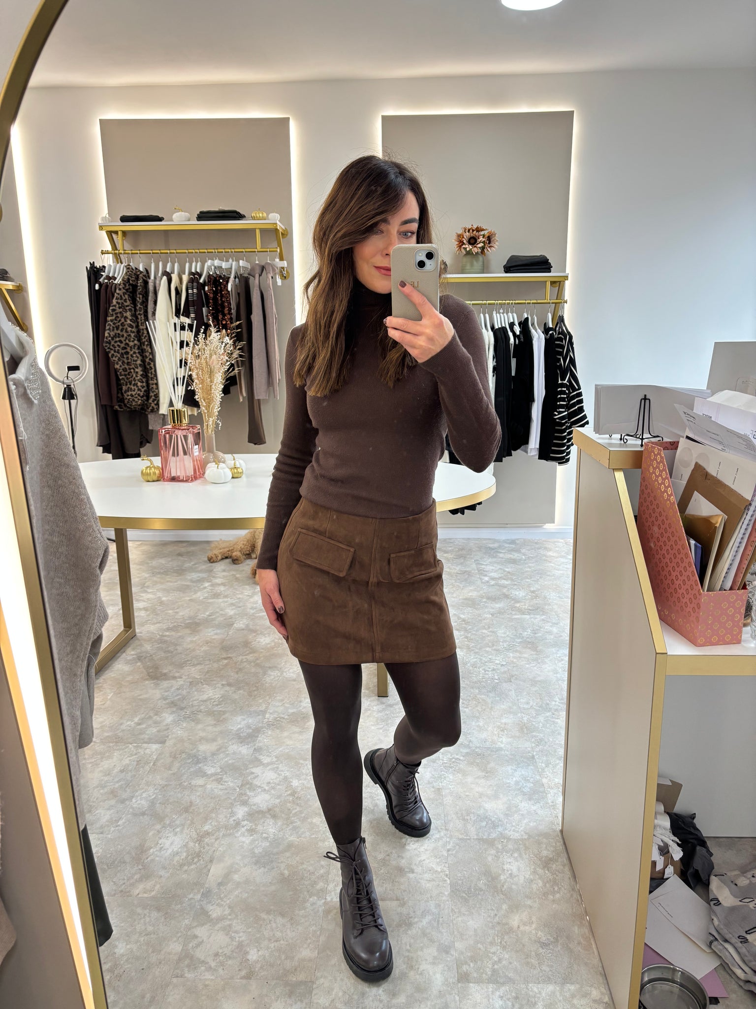A soft touch with a bit of edge. This brown suedette mini skirt has that smooth, velvety feel and simple, flattering cut that goes with everything. The mock front pockets add a little detail without bulk, keeping it sleek and easy to style. Pair it with tights and boots for a cosy autumn look or dress it up with a knit and heels for dinner plans