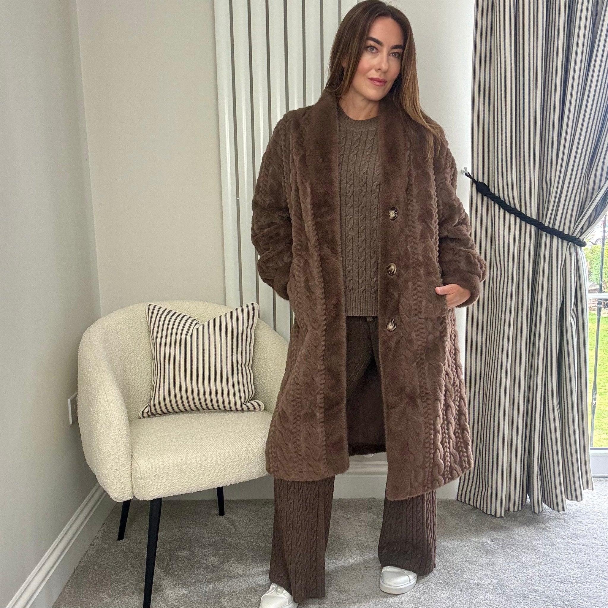 Wrap up in style. This chocolate faux fur coat brings all the warmth with a twist — the embossed cable-knit texture makes it stand out from the usual teddy styles. Finished with statement buttons and side pockets, it’s the coat that does chic and cosy in equal measure. Throw over tailoring, layer with knits or just wear it with denim and trainers for everyday.
