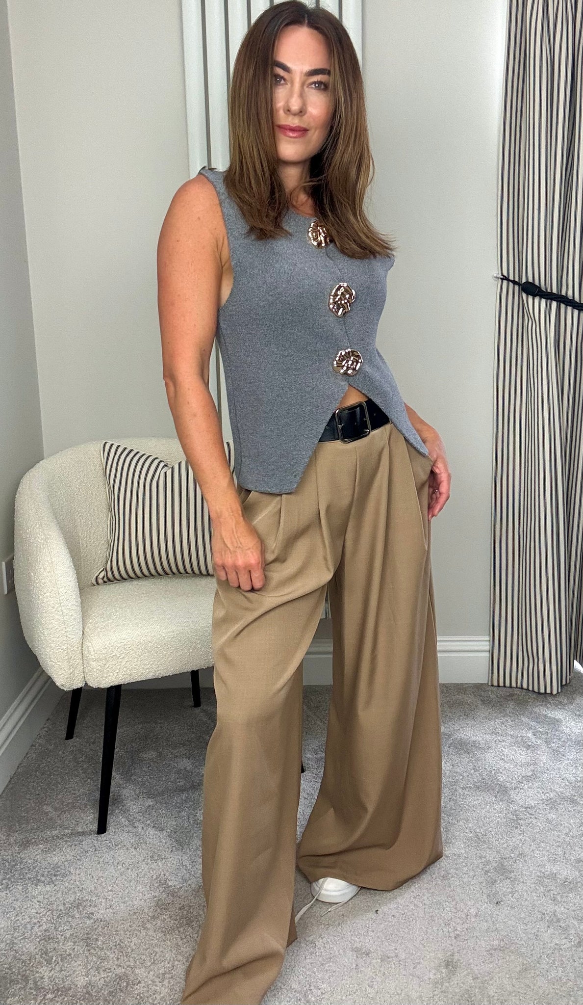 A classic knit with a clever twist. This sleeveless grey waistcoat is finished with oversized gold brooch buttons that can be moved, removed or re-styled to suit your look. The split hem creates a flattering shape, while the soft knit makes it easy to layer over shirts or wear on its own