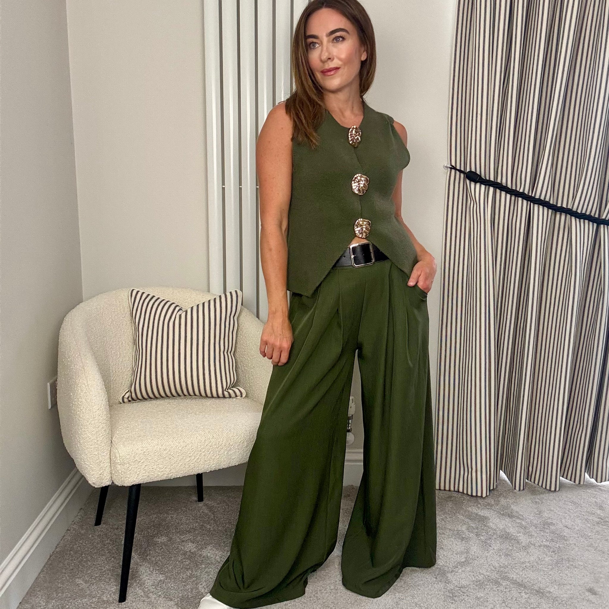 A classic knit with a clever twist. This sleeveless khaki waistcoat is finished with oversized gold brooch buttons that can be moved, removed or re-styled to suit your look. The split hem creates a flattering shape, while the soft knit makes it easy to layer over shirts or wear on its own