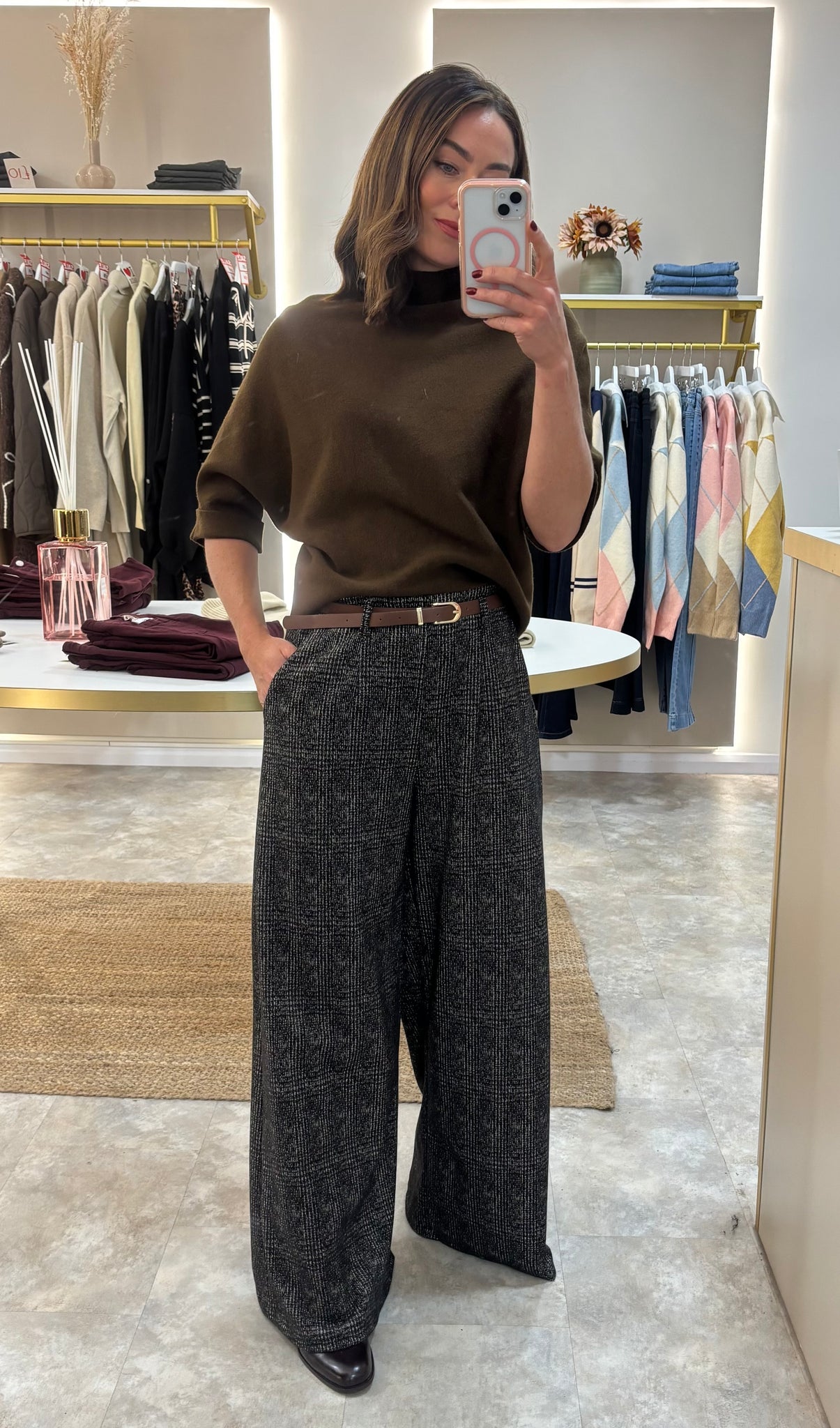 These are the trousers you put on when you want to look put together with zero effort. The brown herringbone fabric gives them that smart, textured finish and the high waist sits really nicely, so the shape feels clean and flattering. The wide leg drapes well without feeling heavy, so they move in a really nice way.