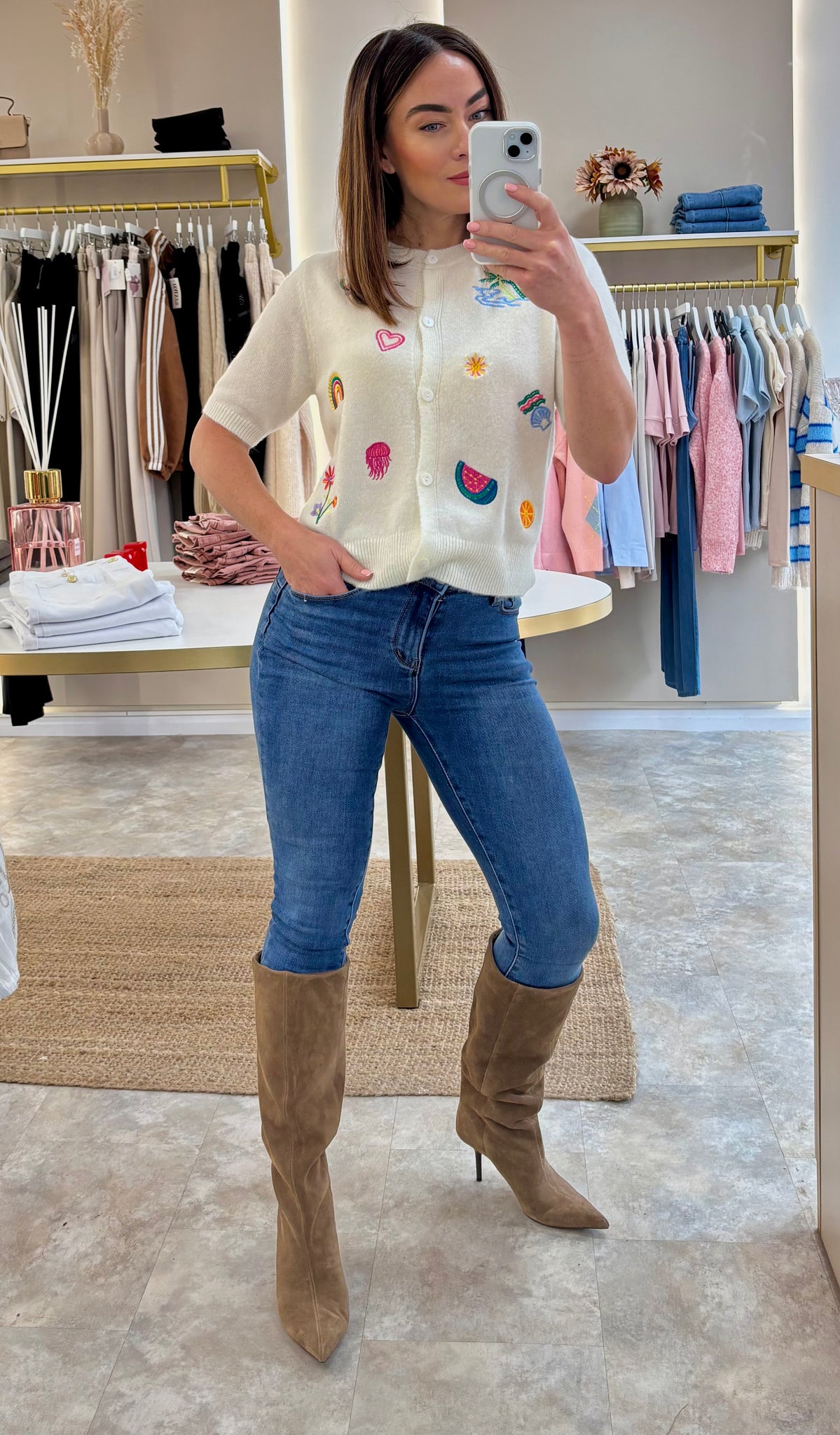 A little bit fun, a little bit cute. This cream short sleeve cardigan features colourful embroidered motifs scattered across the front for an easy statement piece that still feels wearable day to day. Soft knit with a relaxed but neat fit, button front and lightweight feel that works perfectly tucked into denim or worn loose over a cami.