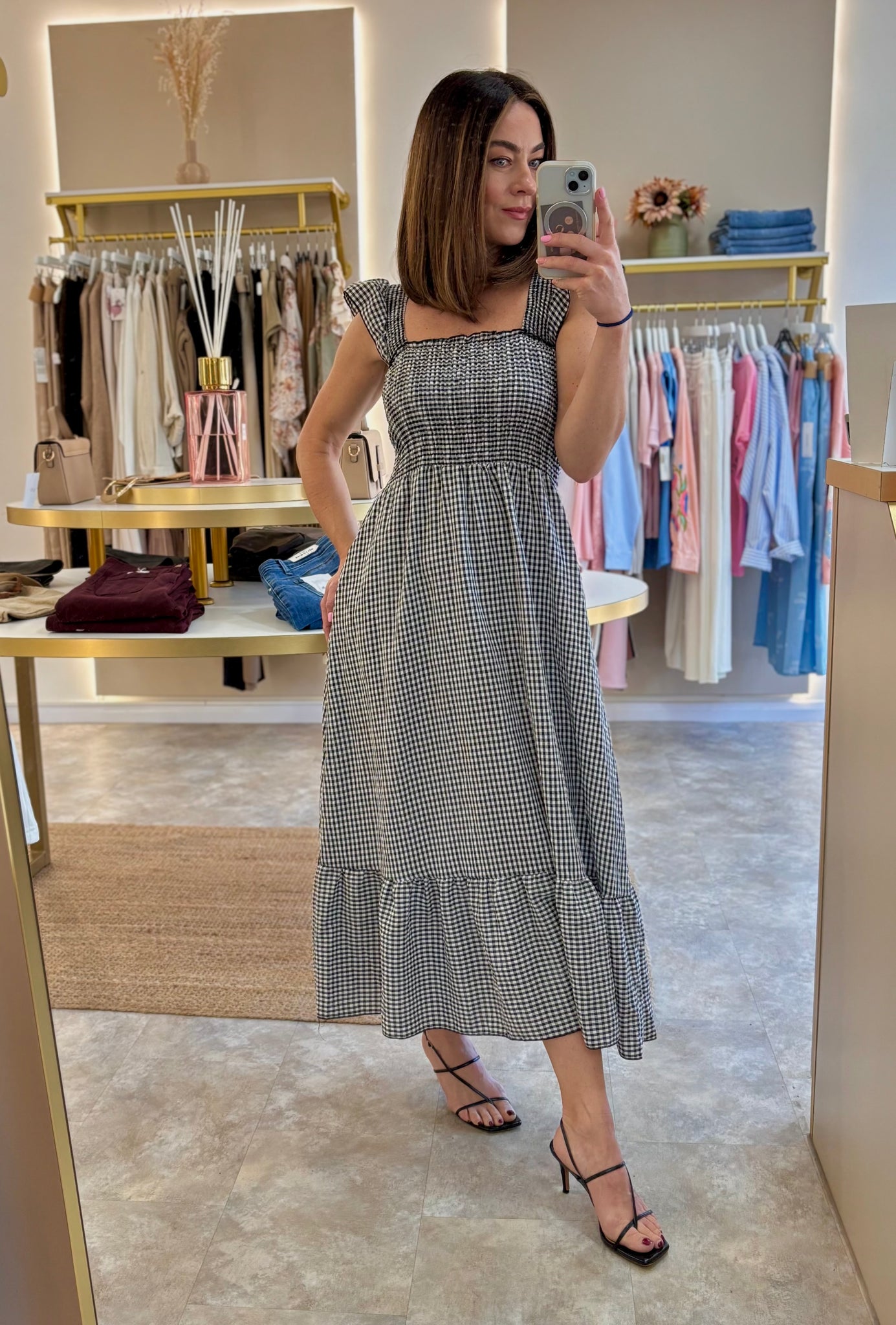 Classic black and white gingham, a flattering square neckline and soft frill straps that give it that feminine edge without feeling fussy. The shirred bodice hugs you comfortably through the bust and waist, then falls into an easy, floaty midi skirt with a subtle tier at the hem.