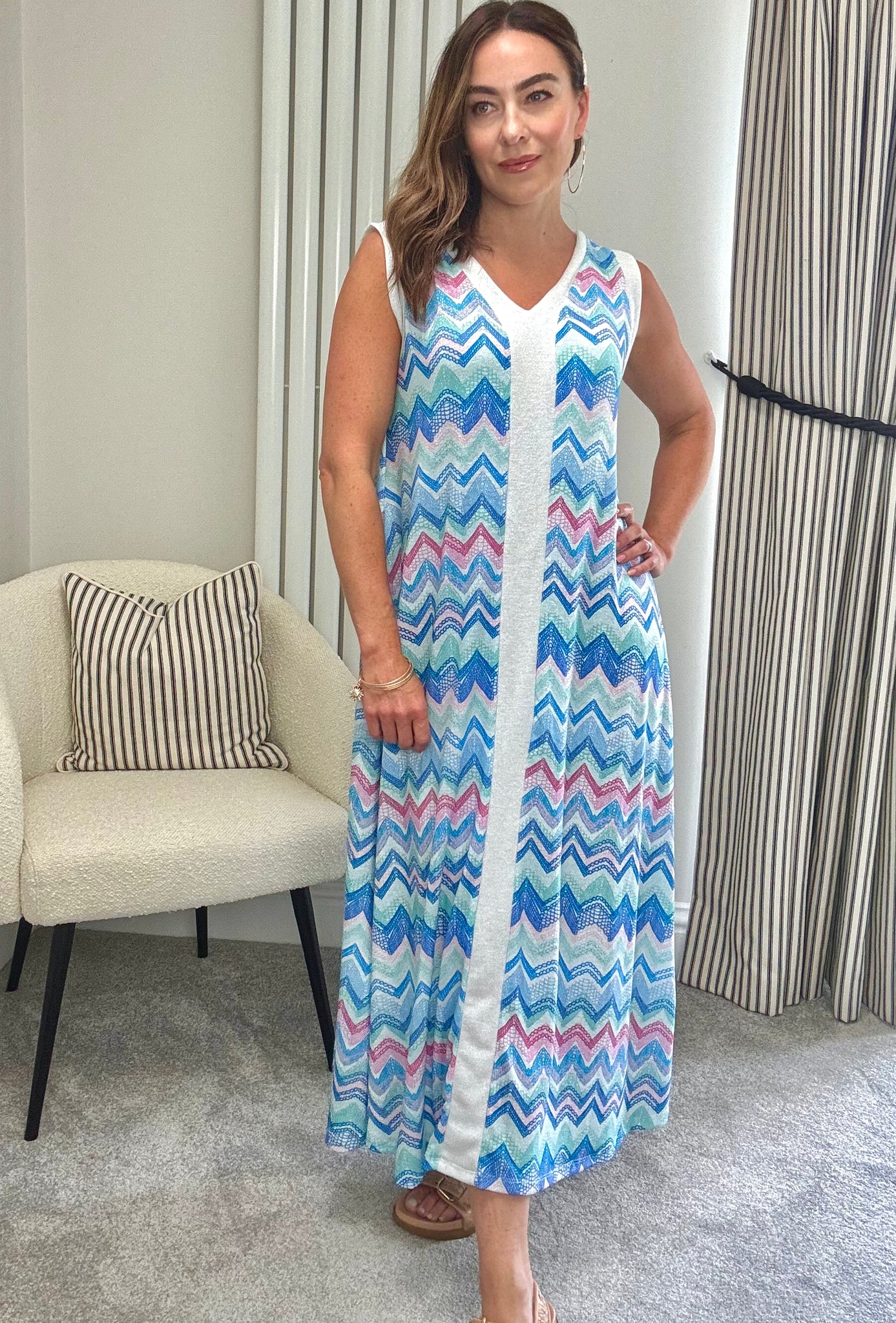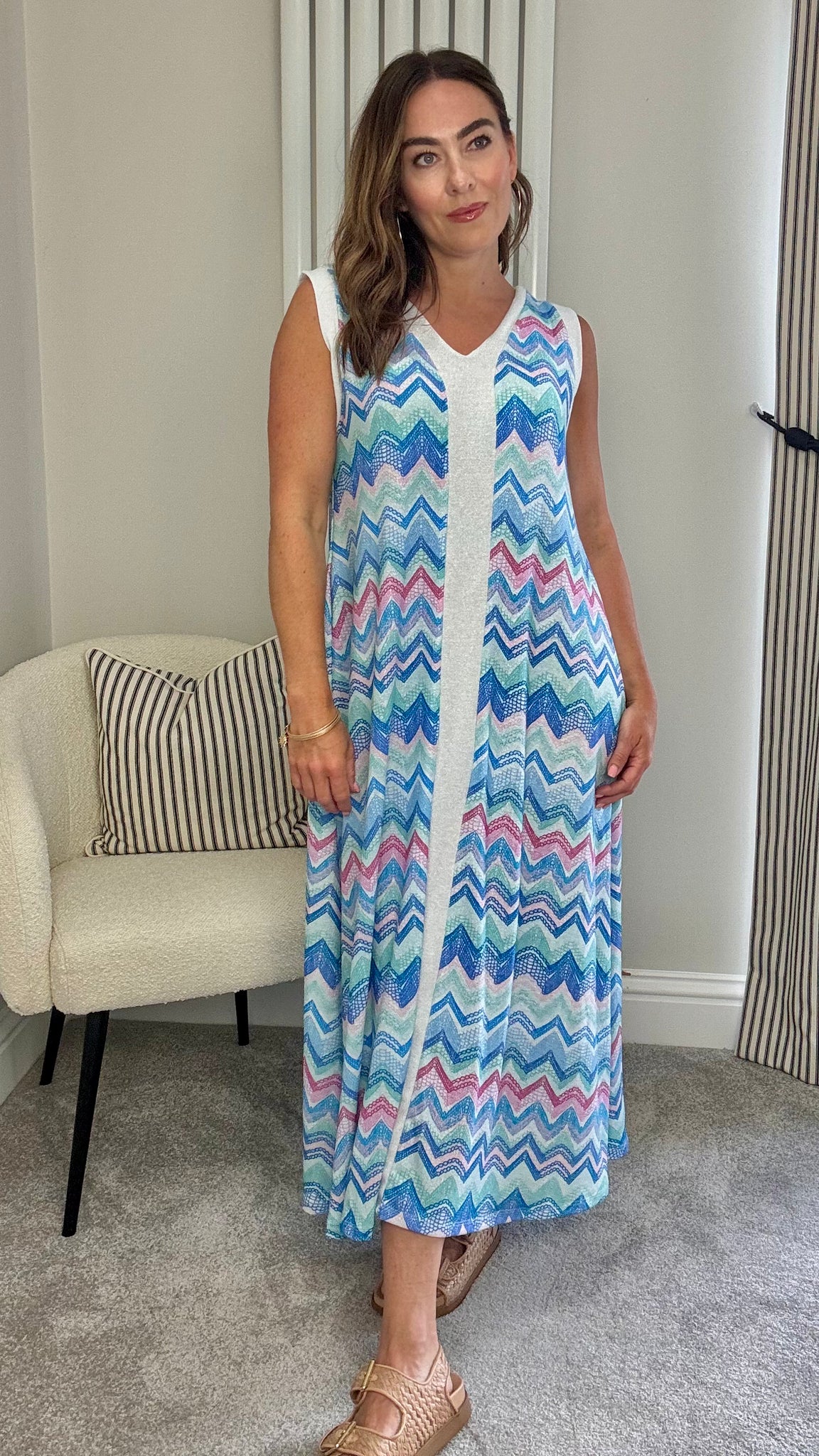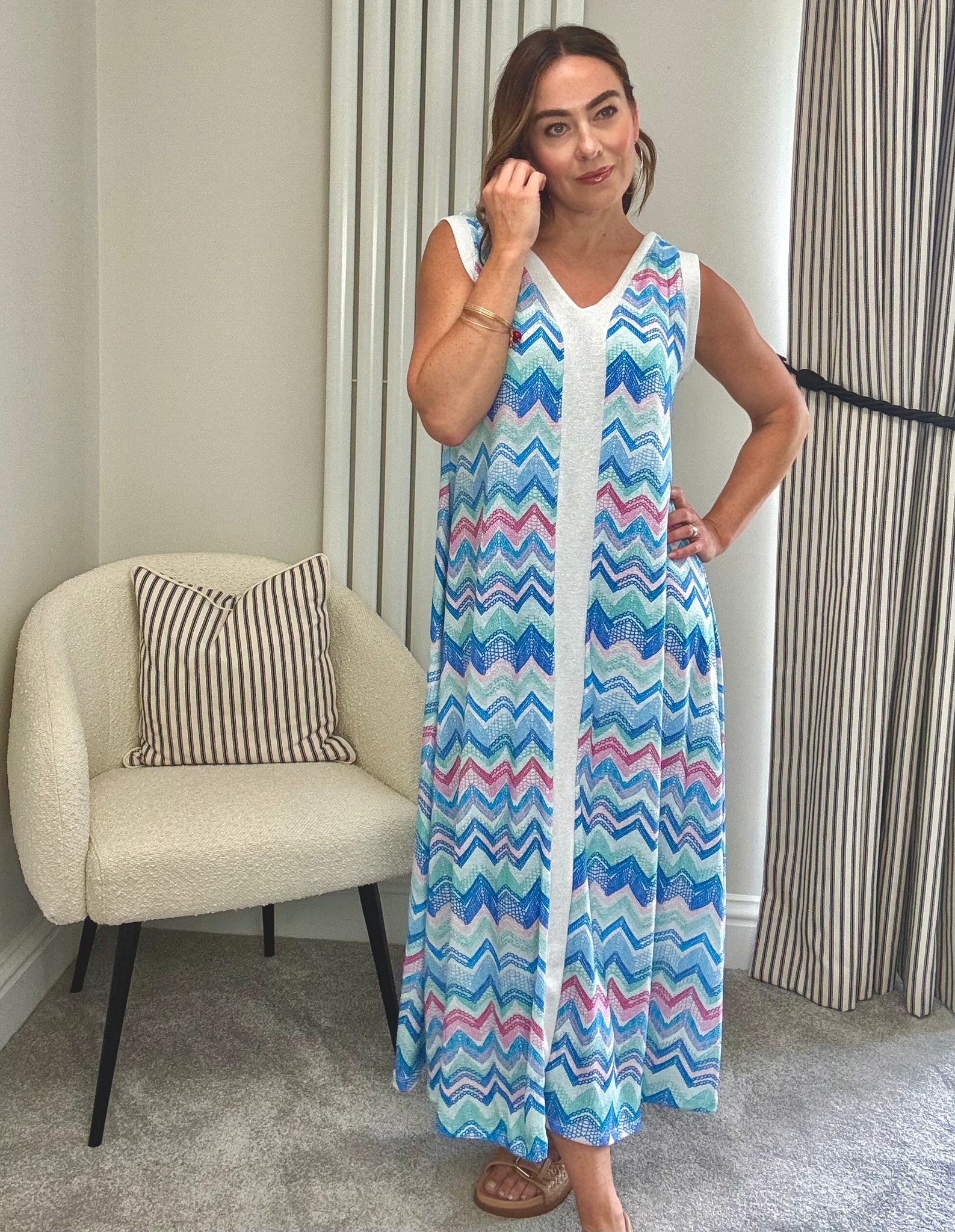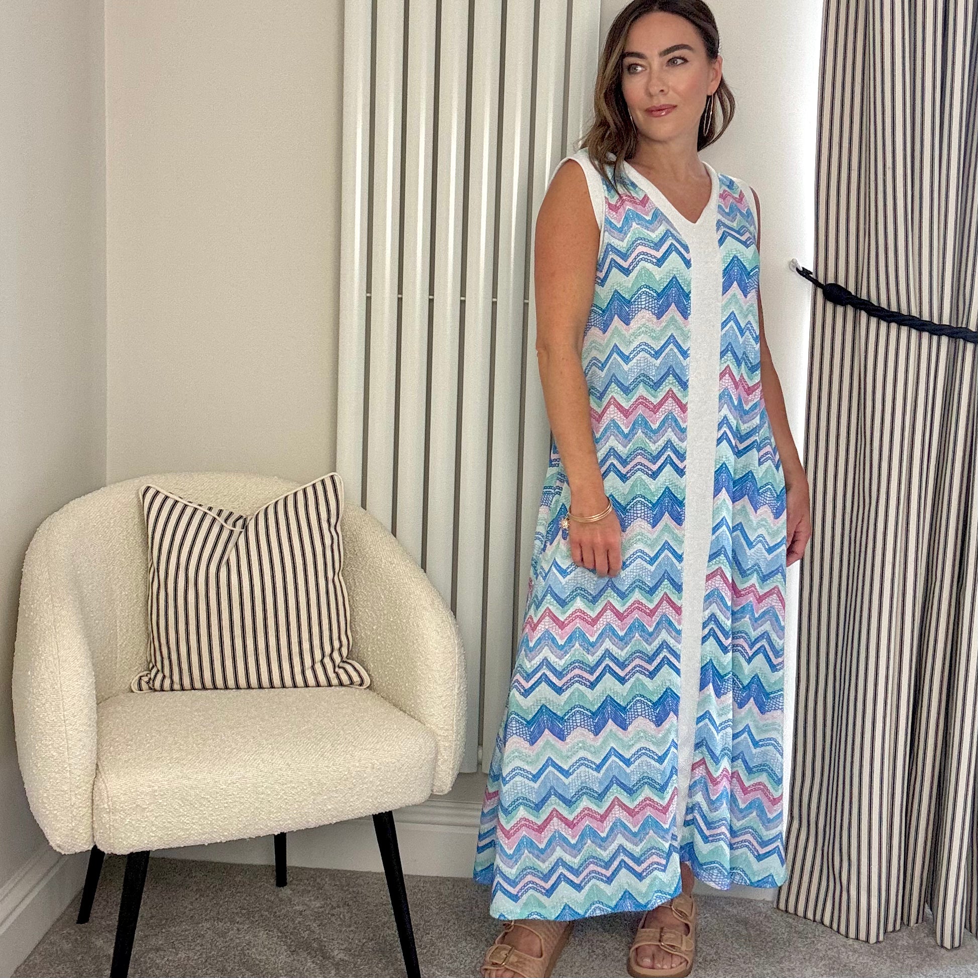 Channel relaxed summer elegance in this beautiful Missoni-style maxi dress. Designed in a sleeveless cut with a flattering V-neckline, it features a bold zigzag pattern in shades of blue, pink, mint, and white — perfect for sunny escapes or effortless everyday style.