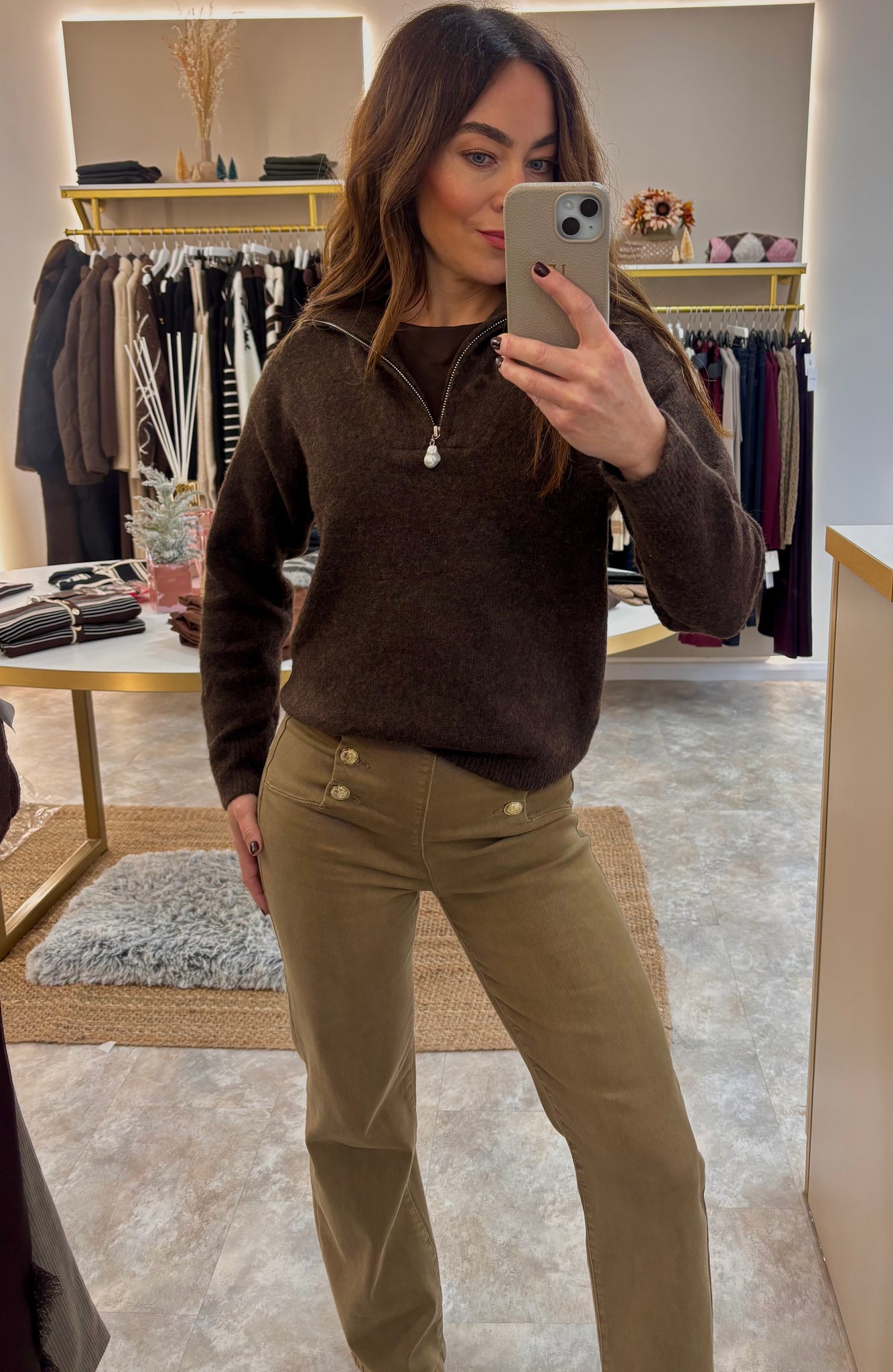 A soft, cosy half zip in a rich chocolate shade that makes any outfit look pulled together. The fit sits nicely at the hip and the knit feels warm without the heavy bulk, so it’s easy to throw on with denim, cargos or a simple skirt.