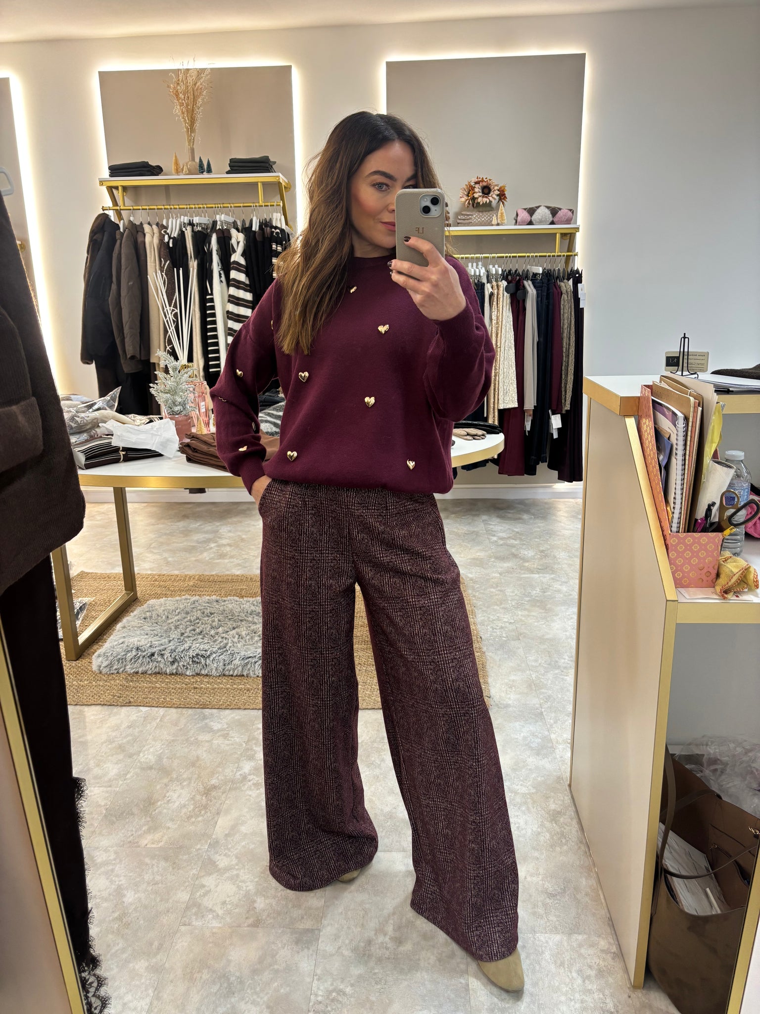 These are the trousers you put on when you want to look put together with zero effort. The brown herringbone fabric gives them that smart, textured finish and the high waist sits really nicely, so the shape feels clean and flattering. The wide leg drapes well without feeling heavy, so they move in a really nice way.