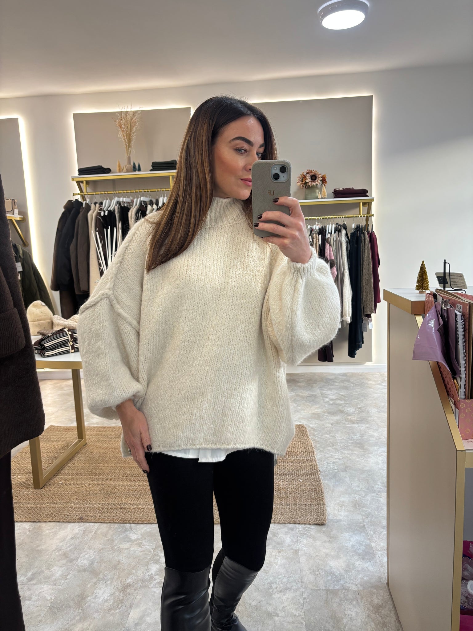 This cosy, chunky knit jumper is a MUST HAVE this season! sports a burgundy cosy colour fabric. With baggy cuffed sleeves and a high neck, this is perfect for layering up on those chilly days! Wear under your oversized coat with leather look leggings and chunky boots.