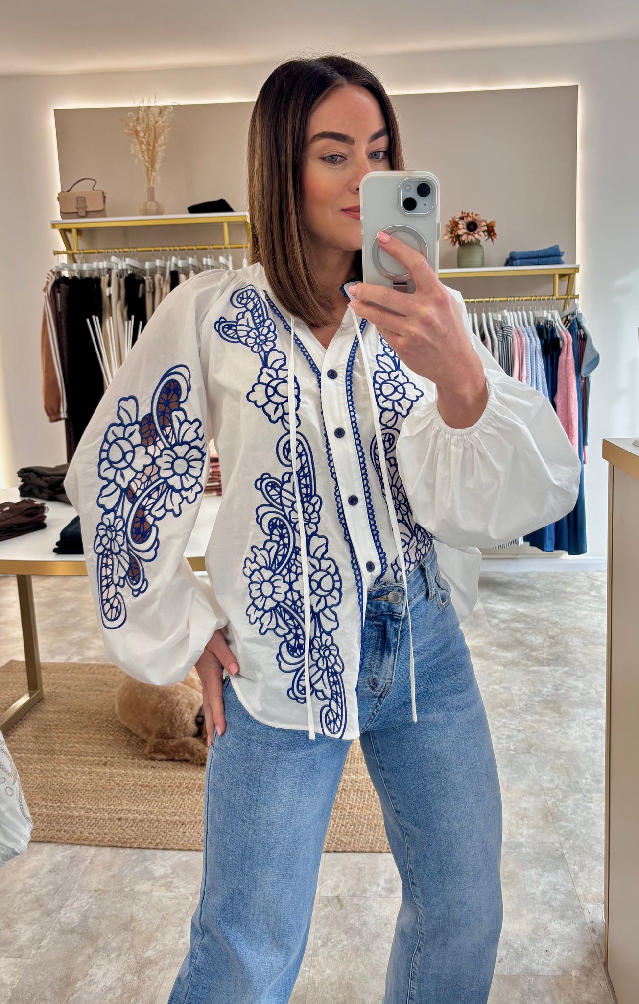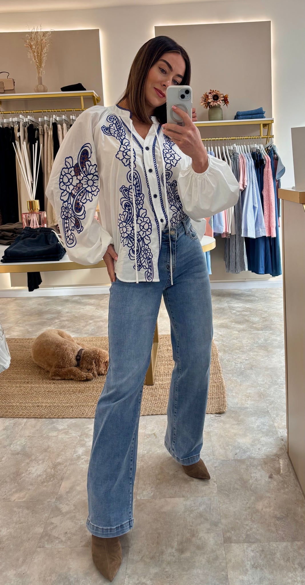 Elevate your everyday wardrobe with this white embroidered blouse, a timeless piece that effortlessly blends sophistication with charm. This elegant blouse features delicate embroidered detailing, graceful bell sleeves that add movement and dimension, and a charming small frill adorning the collar for an added touch of refinement. The tie detail at the neckline allows for versatile styling, whether you prefer a polished knot or a relaxed drape.